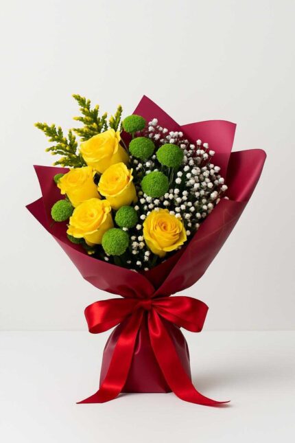 A radiant burst of sunshine wrapped in elegance. Featuring cheerful yellow blooms, this bouquet embodies happiness, warmth, and positivity. Its mellow yet vibrant charm makes it the perfect gift to uplift spirits, celebrate joyful moments, or simply brighten someone’s day with golden smiles. with 20 premium yellow roses, white chrysanthemums, green buttons fillers, perfectly arrange for you.